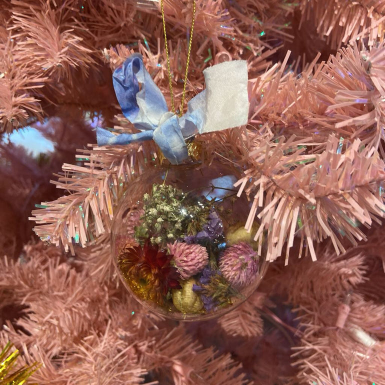 Glass Bauble Dried Flower Ornament: Blue Ribbon