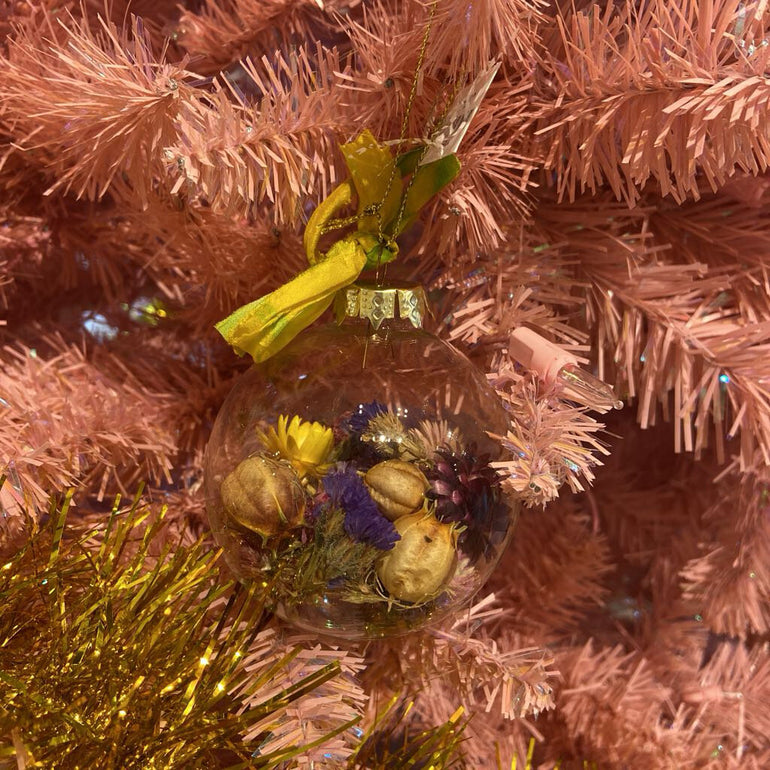 Glass Bauble Dried Flower Ornament: Yellow Ribbon
