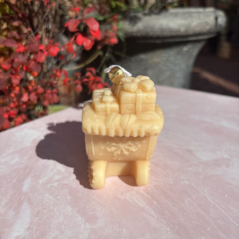 A handmade Santa sleigh candle with a mild fragrance! Measures approximately 4"x2"x2.5". Since these candles are handmade, each is unique and has some color variation!