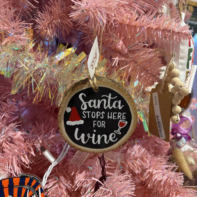 "Santa Stops Here for Wine" Painted Wood Ornament