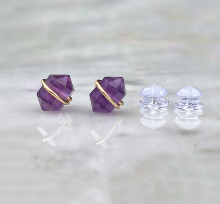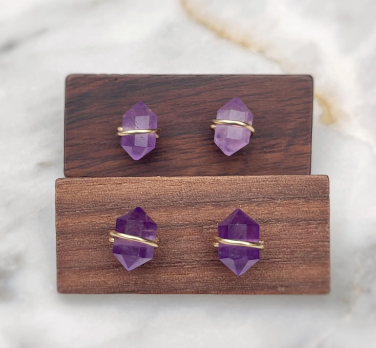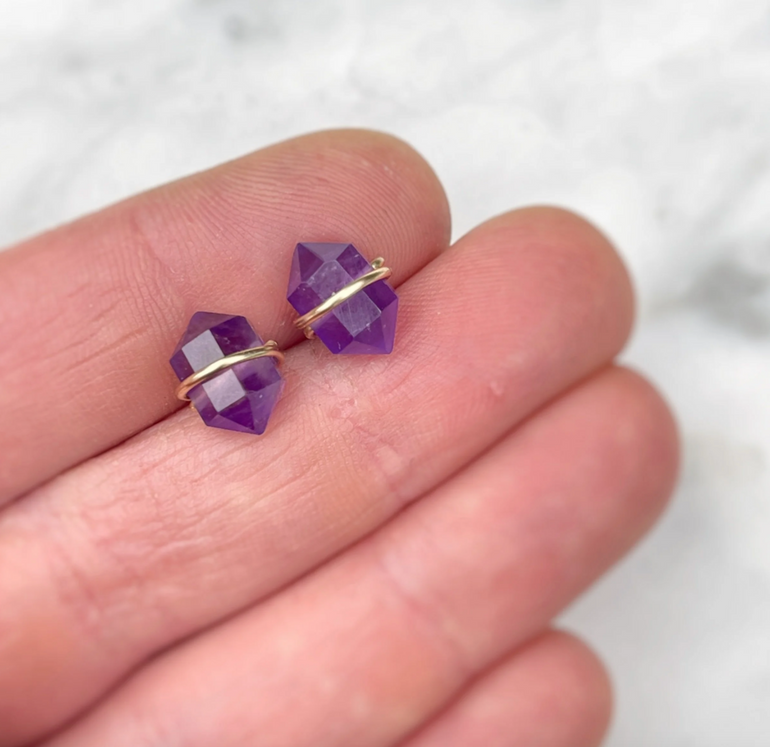 These little gemstone studs are such a sweet, subtle way to add something special to your everyday look. Each stone is securely wrapped with 14k gold filled or solid sterling silver wire that goes straight through the center, so they’re built to last and stay in place. We offer genuine Amethyst, Lapis Lazuli, and Strawberry Quartz—some are more translucent, some more opaque, but all have their own unique charm. No two pairs are exactly alike!