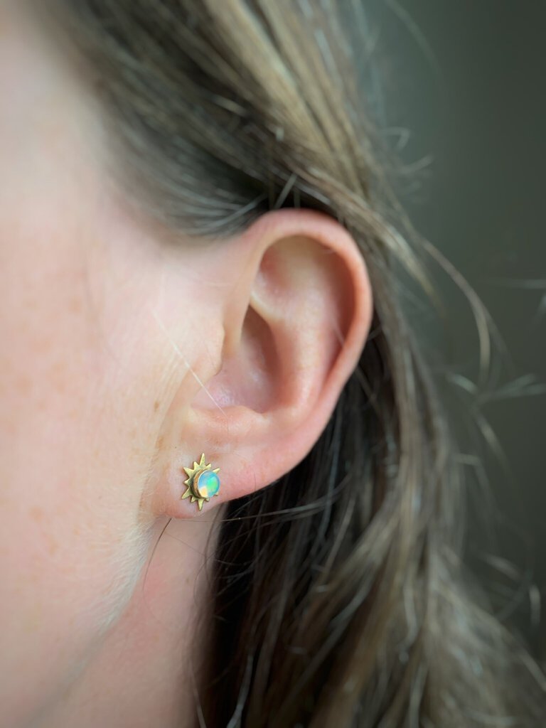 A burst of sun beams set off by the rainbow flash of Opal or Amethyst make these studs come to life!