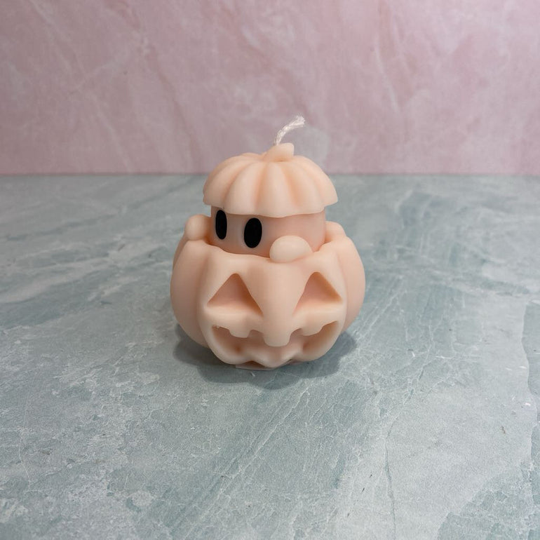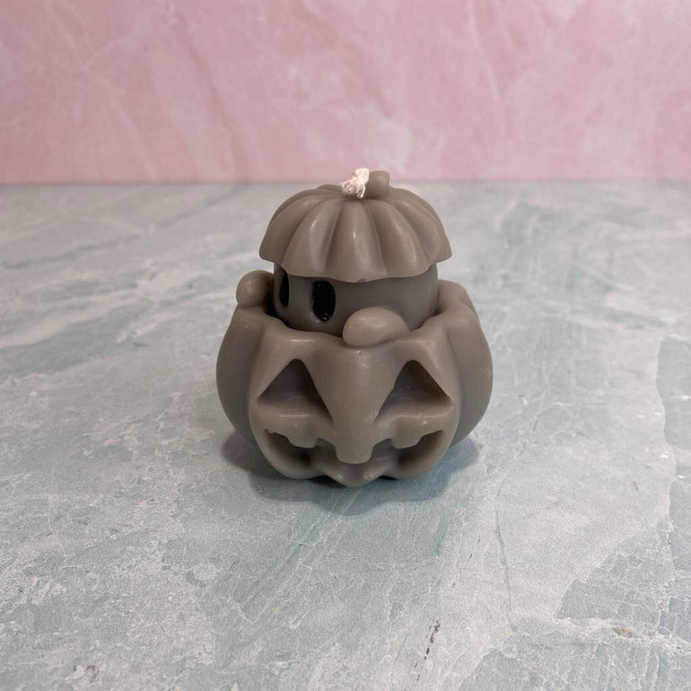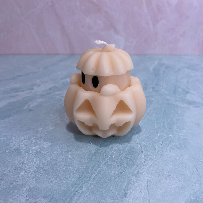 A little shy, but has the spirit! This handmade candle is perfect for low key Halloween fun! Measures approximately 2.5"X3". Since they are handmade, each is unique and some variation is to be expected.
