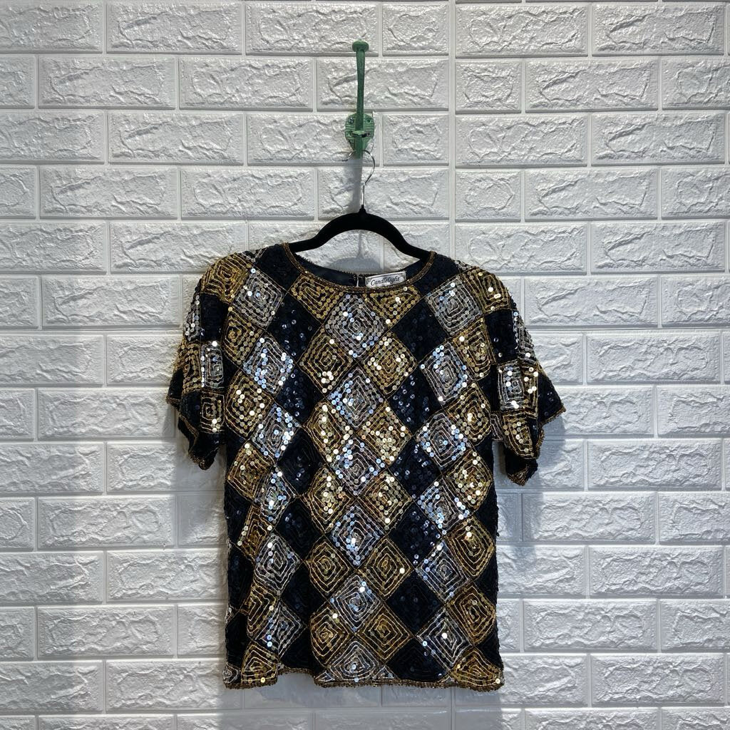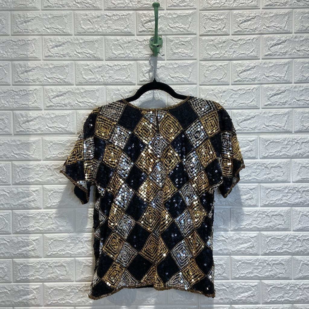 Vintage Sequined Diamond Pattern Silk Top