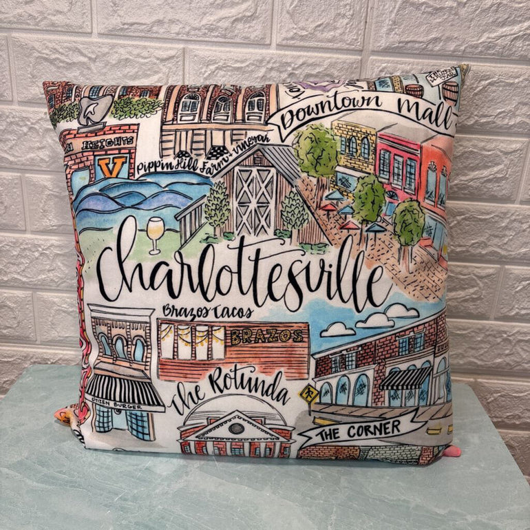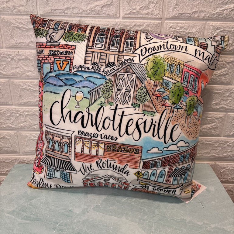 A soft and plush pillow printed with classic Charlottesville landmarks! Measures roughly 18"x18"