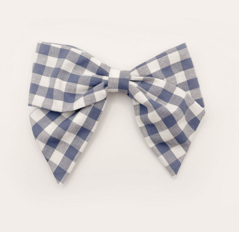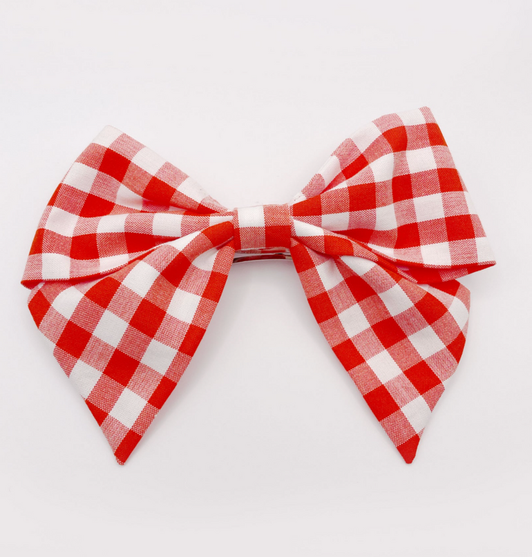 A large handmade hair bow with a rich gingham plaid print. The cotton fabric is attached to a sturdy barrette clip. Comes in Red, Blue, Green, and Orange.