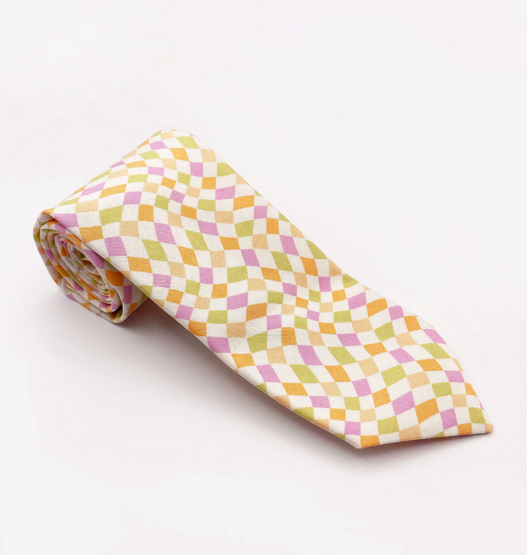 A handmade necktie with a pastel checkered print. Its length and width are perfect for most standard neck sizes, ensuring a comfortable and secure fit. Each tie is carefully hand stitched. *Pocket square sold separately.