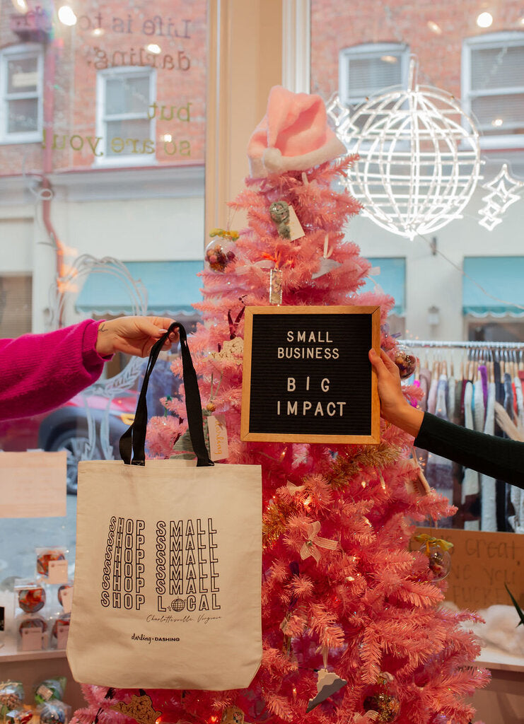 Bag details: Midweight Contrast Handles Cotton Canvas Tote Bag. Text on the bag - "Shop Small, Shop Local, Charlottesville, Virginia" with the DarlingxDashing logo.