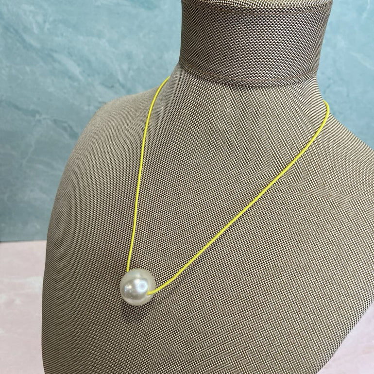 “The pearl” is as half-inch faux pearl necklace, strung on a vivid elastic cord. This unique piece combines understated elegance with a modern twist, making it the perfect accessory for any occasion.